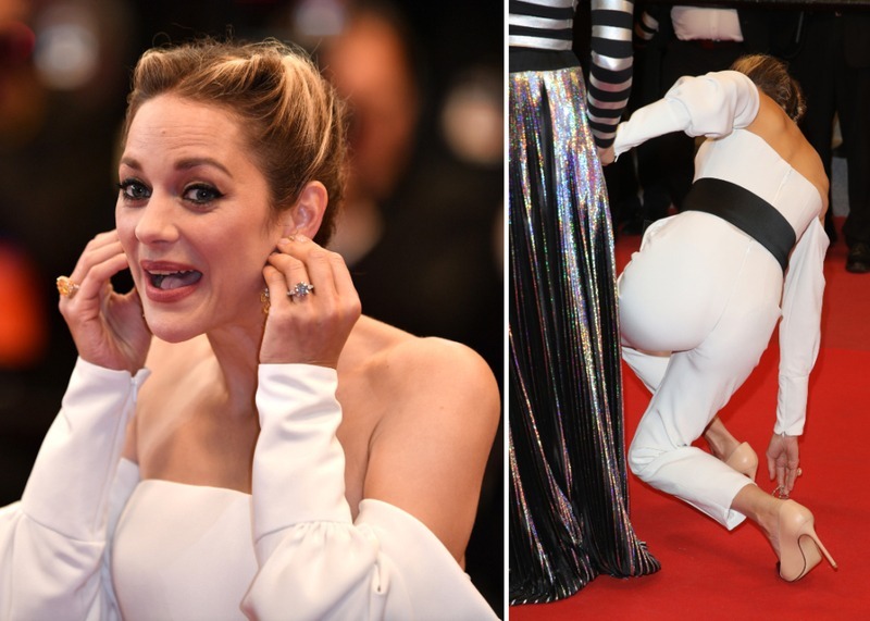 Marion Cotillard, a renowned actress, skillfully performed an acrobatic maneuver to retrieve one of her important, dangling earrings that had fallen off while she was gracing the red carpet at an event. Wearing a tight-fitting white jumpsuit, she attempted not just to bend down, but successfully took hold of another attendee, using the person to maintain her equilibrium. This showed off her nimble and graceful move.
