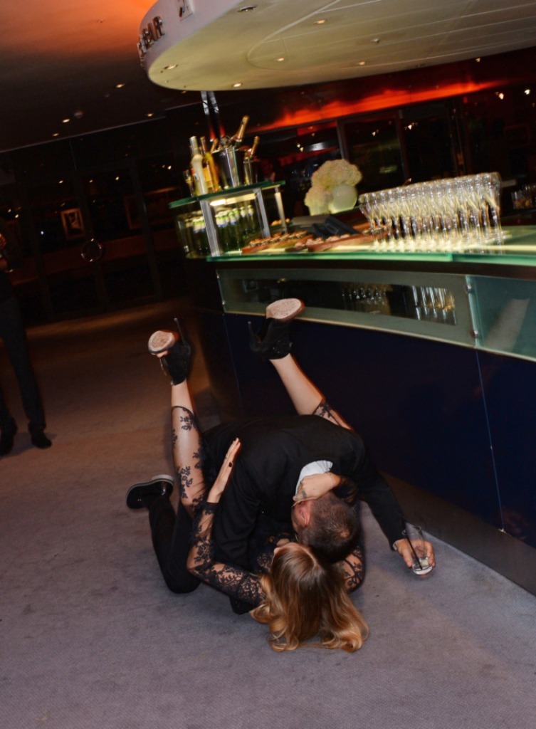 When she tried to latch onto him to prevent herself from falling, they both ended up tumbling to the floor. Regardless of the mess, they found humor in the situation and laughed off their fall in front of the camera, despite wearing high-end fashion pieces which received some dirt. Following the mishap, Cara sprang up and hurried off to grab another beverage.