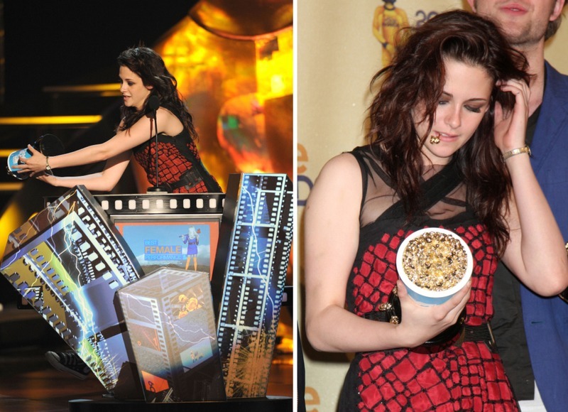 Kristen Stewart, who played Bella Swan in the “Twilight” film series, was honored with the Golden Popcorn award for Outstanding Female Performance at the 2009 MTV Music Awards. The “Twilight” film series was an enormous box office success. After she had finished collecting the prize, she tried to leave the platform, but the trophy slipped out of her hands and dropped it!