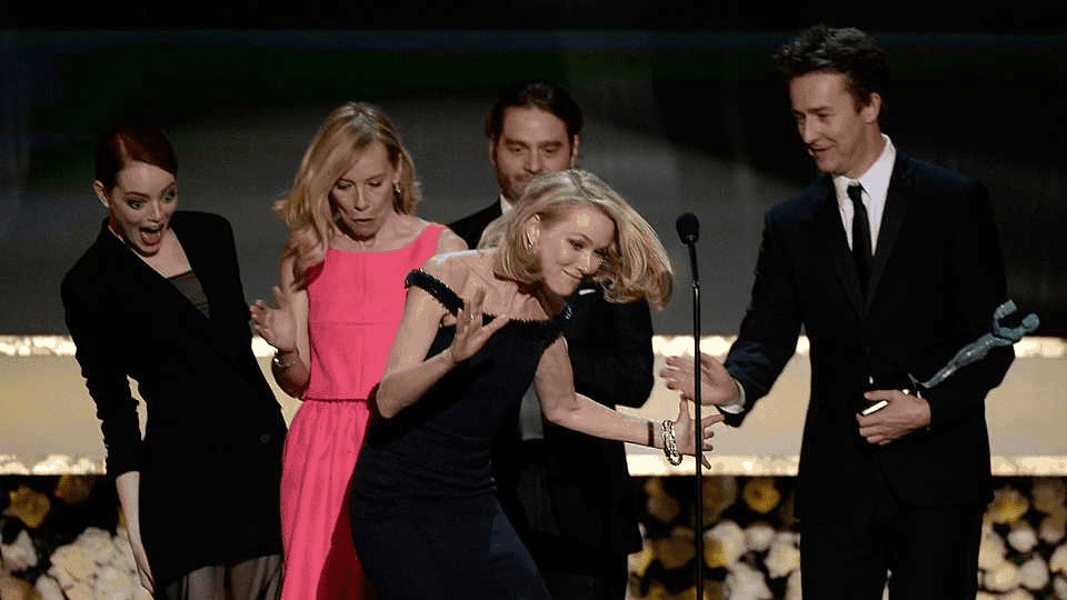 Upon discovering that the film Birdman was nominated for a Screen Actors Guild Award for Outstanding Performance by a Cast in a Motion Picture, Naomi Watts elected to join the rest of the cast on stage at the party.